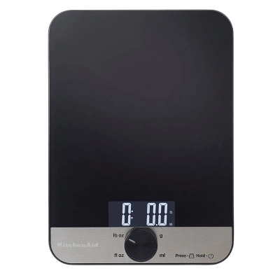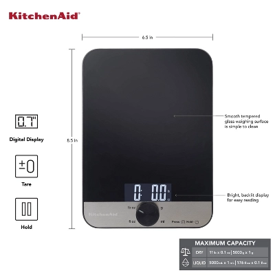 The sleek KitchenAid 11lb Glass Surface Kitchen Scale features an attractive, stainless steel accent trim and an oversized knob to set units of measurement. This scale will match many kitchen decors. Glass is a naturally stain and odor free surface and is tempered for safety. The large 0.7″ readout is easy-to-read. An add & weigh tare function helps to zero out weights of containers before adding food or weighing multiple ingredients together.