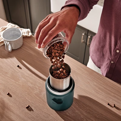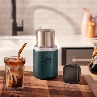 The power to make. The power to move. Create anywhere using the KitchenAid Go™ Cordless Blade Coffee Grinder in Shaded Palm, made by KitchenAid in partnership with Hearth & Hand™ with Magnolia. Powered by a rechargeable 12v MAX removable battery (sold separately, model KRB12), the new cordless blade coffee grinder delivers 6 minutes of continuous run time* and performance, so you can cook wherever, whatever, and however you choose. *Maximum initial battery voltage (measured without a workload) is 12 volts. Nominal voltage is 10.8. Actual run time will vary based on recipe and/or attachments used. Battery life impacted by factors such as battery age and use.